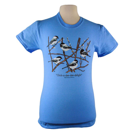 This delightful shirt shows a small flock of black-capped chickadees resting on branches with winter buds accompanied by a playful take on their call.