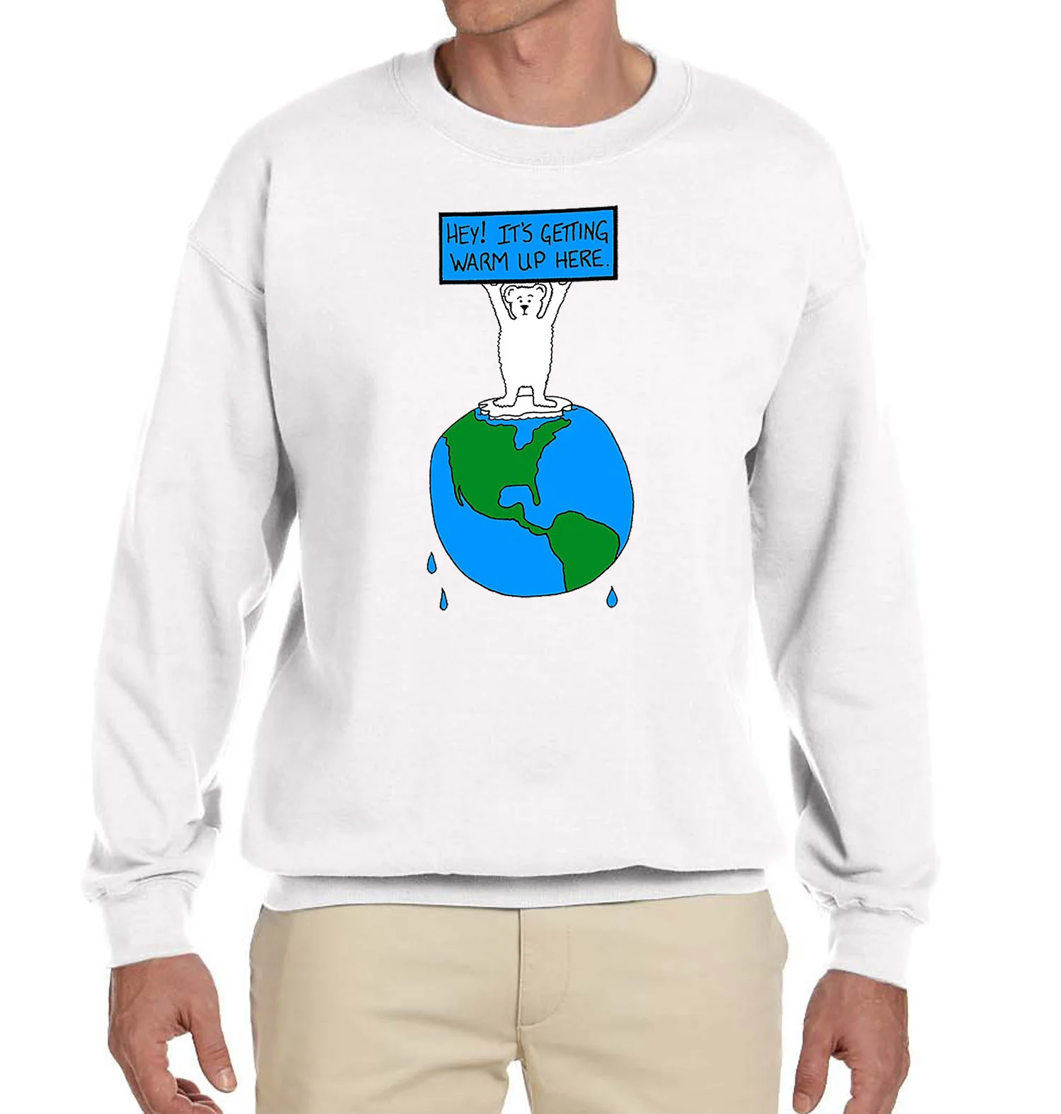 Show your support for wildlife endangered by climate change. T-Shirt of a polar bear standing on top of the melting earth holding a sign, "It's Getting Warm Up Here!" in reference to global warming. Artwork by Ann Devish.