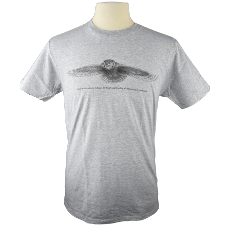 This shirt shows one's appreciation of these "winged tigers." Beneath the owl is a line of poetry from Jim: "Sense the diversity and richness, the beauty and fragility, all harmoniously intertwined."