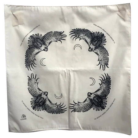 This shirt depicts a soaring red-tailed hawk from below accompanied by a crescent moon and the phrase, "fly beyond words where nature sings." Red-tailed hawks range from the northern treeline of the taiga south to Nicaragua and the West Indies. Their diet consists largely of small mammals, particularly rodents and lagomorphs (rabbits and hares).