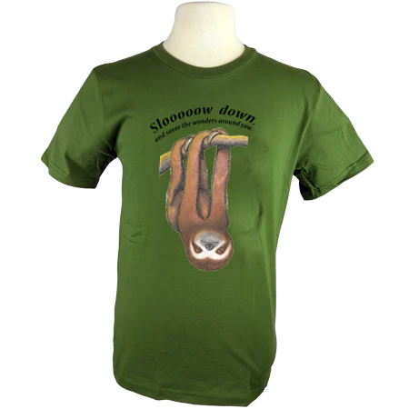 This tree sloth design reminds us to slow down, take a breath and appreciate the wonders of nature. This will make our lives fuller. Similar to the "slow food movement" and "slow money movement" we are reminded to enjoy and savor life. Cook and eat with our friends and family. Keep our money going to sustainable organizations. Just slow down!