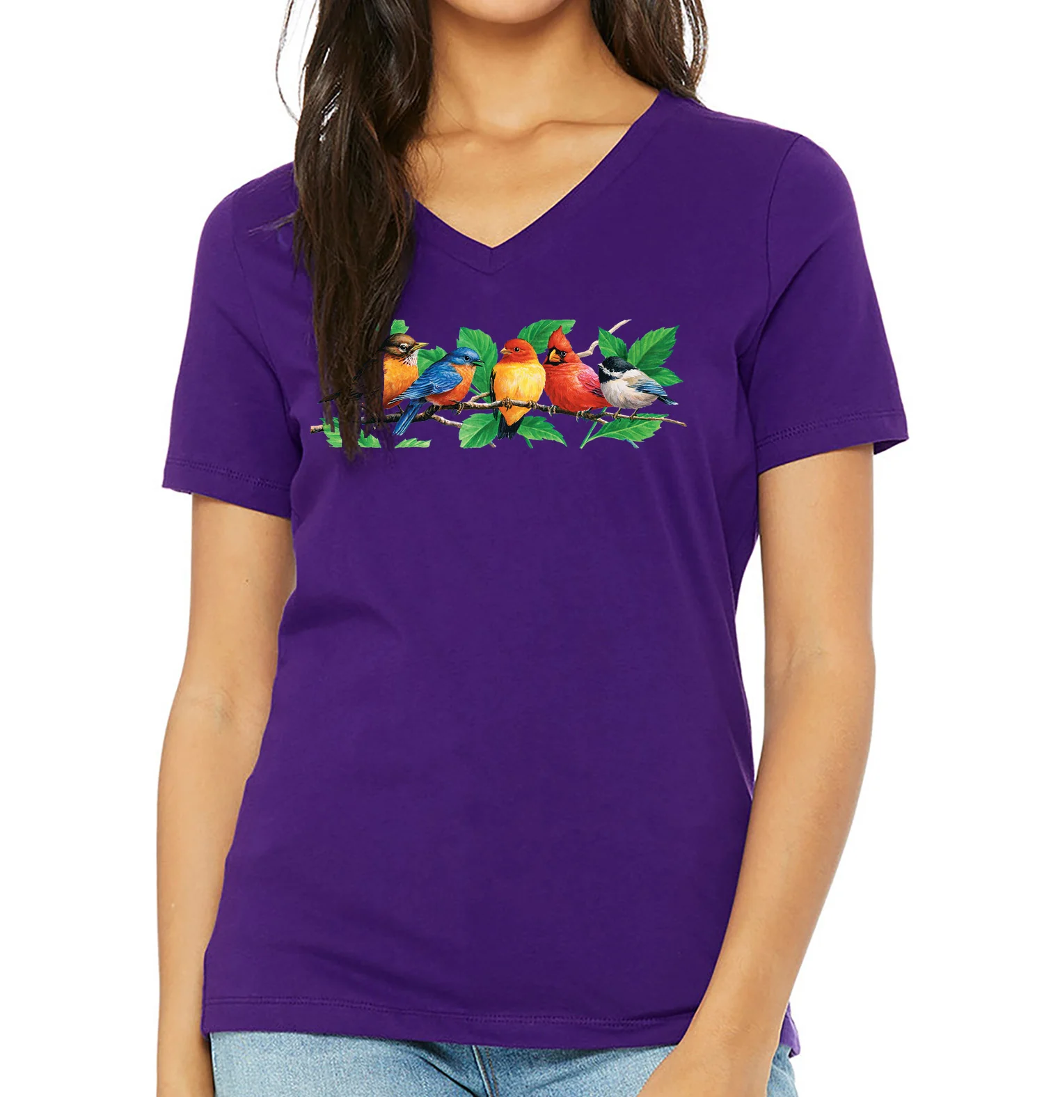 Spring birds; Robin, bluebird, tanager, cardinal and chickadee.